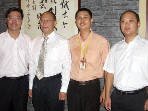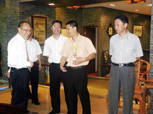 大涌鎮(zhèn)文衛(wèi)戈鎮(zhèn)長(zhǎng) 中家協(xié)陳付理亊長(zhǎng) 吳赤宇總經(jīng)理 彭付鎮(zhèn)長(zhǎng) 在參觀中合照留念(上圖)